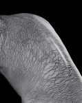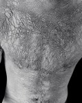 In this work, my models are transformed by covering them in many layers of paint, allowing it to dry and crack. The images are of sections of the body where identity can be obscured. The detail of the cracked paint combines with the shape of the body to create something harshly foreign, yet still reminiscent of a human form.